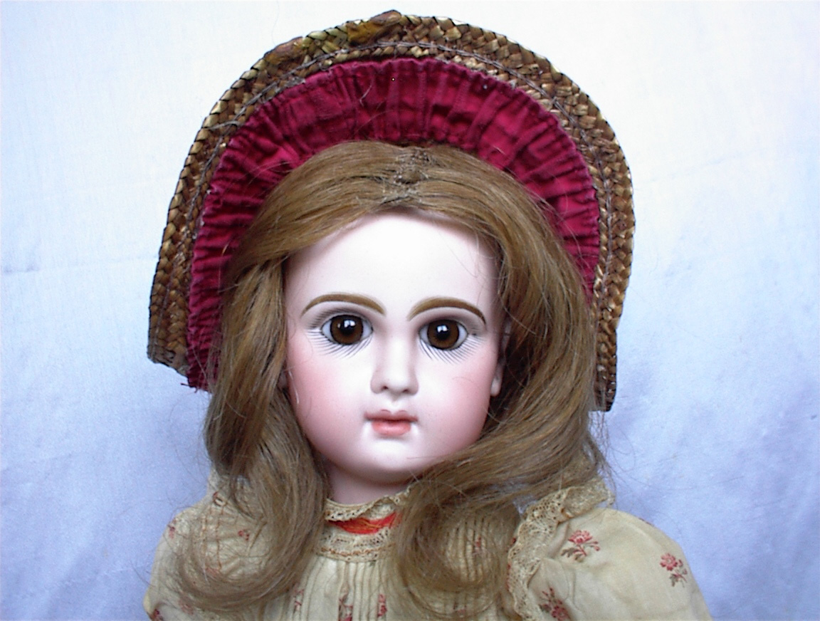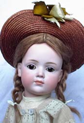 17” Kley & Hahn 546 Character Child with glass eyes.Wonderful original example of a very endearing child. Perfect bisque, great modeling, brown glass sleep eyes, perfectly painted features and big huge pouty lips to envy. Original auburn braided wig and pate. Matching slip and undies. Her outfit is that of a typical school girl of the times. White leather antique shoes and socks. Her antique straw burgundy hat completes her.