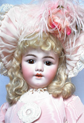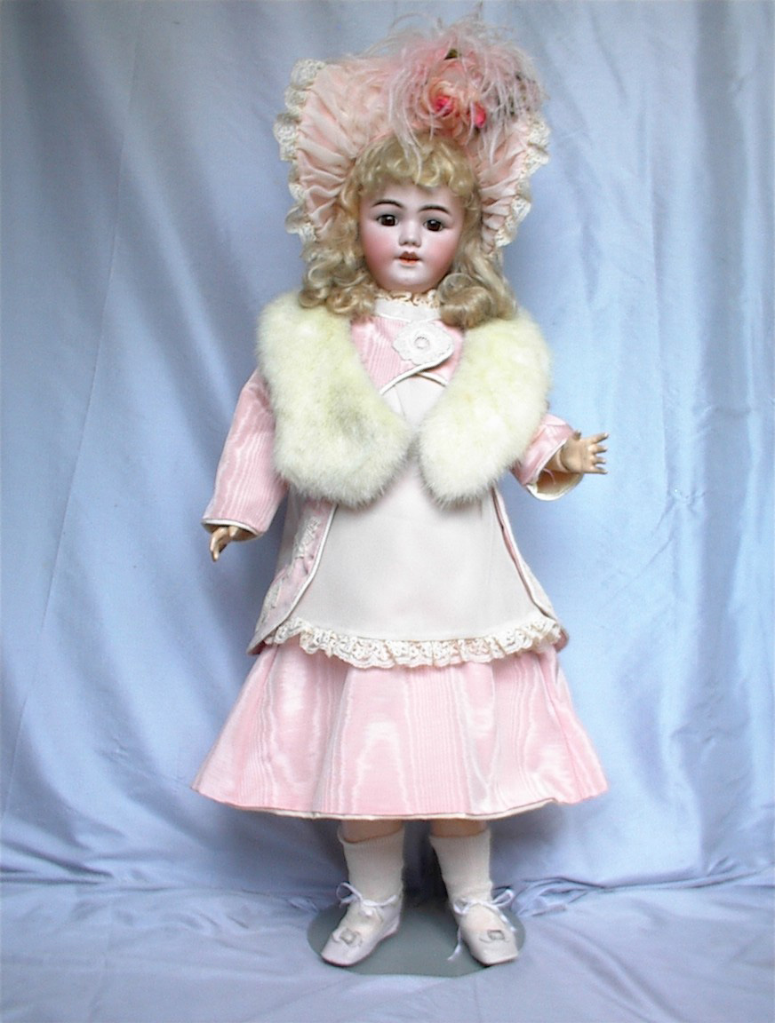 No collection is complete without a Santa, and this one is truly a show stopper. One of the most beautiful ones we have ever had. Her costume of pink moiré taffeta (not sure of the spelling) artfully designed and beautifully carried out with white flower appliqués on the sides of the bodice. She wears her original wig under her lavish hat, which frames, her big brown eyes and flawless bisque, enhanced by the faux boa, her shoes and undies appear to be all original. She is 28”.