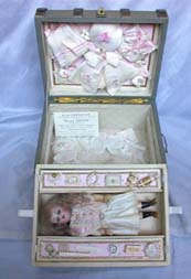 Outstanding French Presentation trunk with original store card included.. The store card translates as follows: “ Guyon Company, Specializing in fine dolls, baby dolls and unbreakable dolls. Hats, trousseaux, outfits and shoes, miscellaneous items. “New elegant and affordable,(Bon Marche)”. We do repairs and deliver outside of Paris”. Masion Guyot 6 1/2" super little K * R 192 walker girl, is surrounded on both sides with an assortment of darling sized fripperies. Comb and brush, watch, binoculars, mirror, necklace, purse, bottles, etc. Exquisite clothes are on the inner cover, and lift the tray to find all her undies, bedclothes and chapeaus. Finest workmanship, a sight to behold. The trunk itself is a work of art. Leather straps adorned by metal clasps. Brass handles on both sides for lifting. 8" L X 6" W and 4 1/2" D. Just opening it is breathtaking.