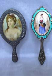 The first being a lovely portrait of a beautiful young woman, the second a silver turquoise blue enamel depicting a young maiden and the third, a Victorian with soft subtle dried flowers. Any would make a lovely accessory for a favorite doll.
