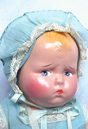 12” Effanbee “Grumpykins” Circa 1927 with UFDC Ribbon. One look and you will know why this little Grumpy won a ribbon in competition at UFDC in Washington DC this year. Pristine example looks like he just walked out of the factory! Marked on back of shoulder plate: Effanbee Dolls, Walk Talk Sleep. Composition head and shoulder plate, jointed composition limbs and a stuffed cloth body with a non working crier. Just look at that face! Factory original from tip to toe.