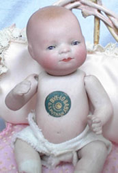 5”All Bisque Bye-lo baby with pink cradle. What an adorable little baby girl! Swivel head, blue sleep eyes, original label on tummy, painted pink shoes and white socks! She wears her diaper, but comes with an antique gown, slip and bonnet. She also comes with her too precious pink vintage cradle, (8” L x 4 1/2” W x 6”H), crochet blanket, pink mattress with tiny quilted cover and a satin pillow. Just a charming little cherub.